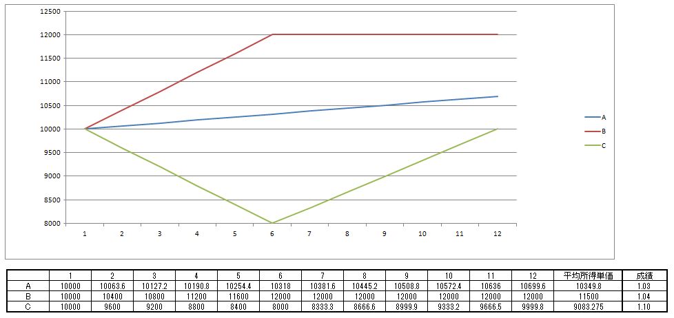 最終的な株価はCが一番低いですが、暴落時に積立てた量が光り一番優秀な成績でした。